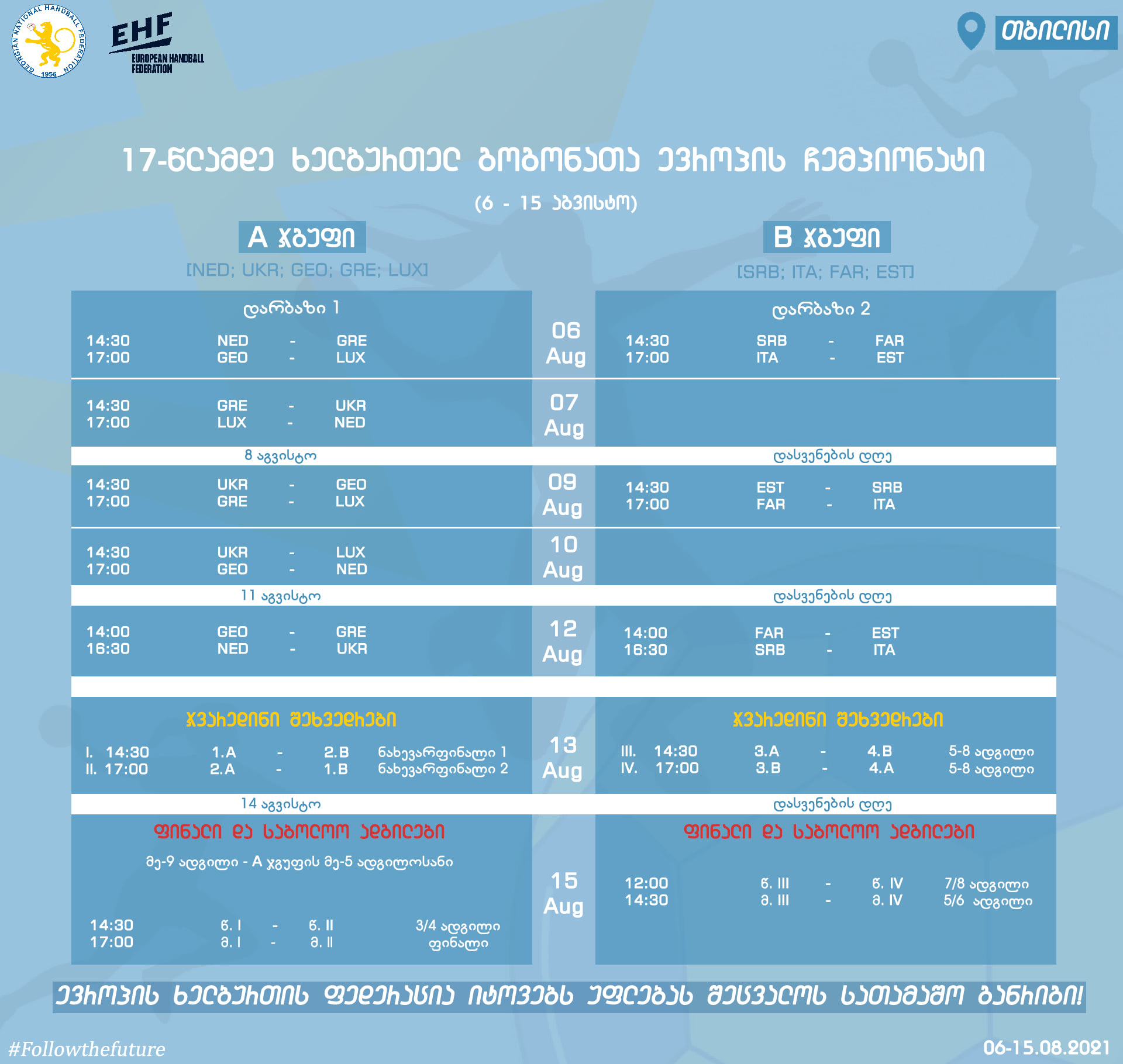თბილისის ოლიმპიურ სასახლეში, ხვალიდან, 6 აგვისტოდან 17-წლამდე ხელბურთელ გოგონათა ევროპის ჩემპიონატი გაიმართება. საქართველოს დედაქალაქში, 10 დღის მანძილზე, 10 გუნდი, საუკეთესოს გამოველნას შეეცდება. ტურნირის დებულების თანახმად, ევროპის ჩემპიონატის მონაწილე გუნდები, ორ ჯგუფში გადანაწილდნენ.