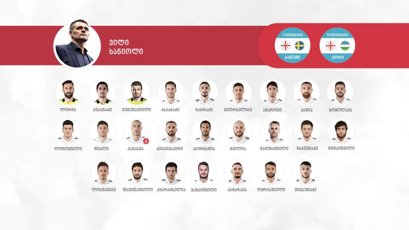 მამარდაშვილისა და ხვადაგიანის გარდა, საქართველო-შვედეთის მატჩს, ყვითელი ბარათების გამო, გურამ გიორბელიძე და ლაშა დვალიც გამოტოვებენ. სამაგიეროდ, ჯანმრთელობით გამოწვეული ხანგრძლივი შესვენების შემდეგ, ეროვნულ ნაკრებში კვლავ დაუძახეს ნიკა კაჭარავას, რომელმაც „ანართოსისის" ბოლო შეხვედრებში თავი გამოიჩინა. თუმცა, სათამაშო პრაქტიკა, ზემოთხსენებული მიზეზის გამო, მას ჯერ კიდევ აკლია. ვერც ამ ჯერზე, საქართველოს ნაკრების შემადგენლობაში არ იქნება ოთარ კიტეიშვილიც.