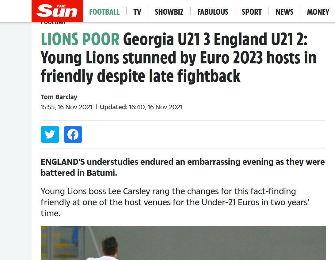 ინგლისის 21-წლამდე ნაკრები, საკუთარ თავში იმდენად დარწმუნებული გამოვიდა, ბათუმი არენაზე, საქართველოს თანატოლებთან სათამაშოდ, რომ სანამ 3 გოლი არ გაუშვა, მანამდე ვერ მიხვდა, რომ ყველა გუნდთან ბრძოლაა საჭირო. მათ შორის საქართველოსთან, რომელსაც ბრიტანელები, თუ „ბრიტანიკას" არ ჩავთვლით, არა მხოლოდ ფეხბურთის მხრივ, ისეც, დიდად არად გვთლიან. „გვიანი ომის" მიუხედავად, რომელიც ბრიტანელებმა თამაშის მიწურულს გამართეს და ორი გოლის გაქვითაც მოახერხეს, პოპულარული გამოცემა The Sun, საკმაოდ დიდ ქარ-ცეცლხლში ატარებს, საკუთარი გუნდის მთავარ მწვრთნელს, პრემიერლიგის ჟღერადი სახელების მქონე კლუბებში მოთამაშე „ახალგაზრდა ლომებს", რომლებმაც, ორ სიტყვაში რომ ვთქვათ, არ შეაფასეს მეტოქე და ბათუმში, საქართველოს 21-წლამდე ნაკრებთან 3-2 წააგეს.