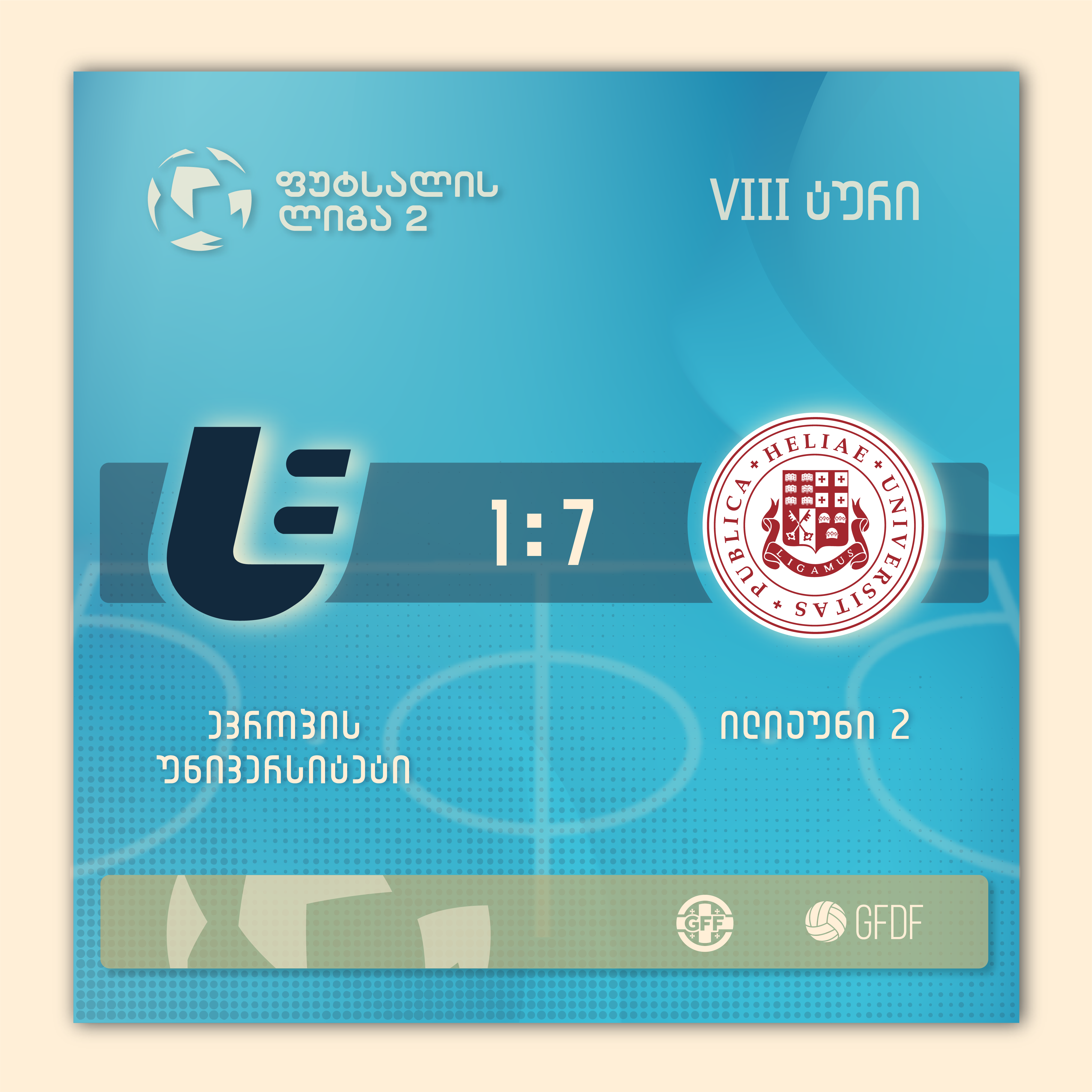 მეორე წრის მატჩში, „ილიაუნი 2", „ევროპის უნივერსიტეტს" დაუპირისპირდა. დაძაბული სტუდენტური დერბი ილიაუნის სასარგებლოთ 7-1 დასრულდა. შეხვედრის მე-2 წუთზე ანგარიში გიორგი ქუხულმა გახსნა და EU დააწინაურა. წონასწორობა, მალევე აღდგა და 25-ე წუთისთვის „ილიაუნი" მეტოქეს სამბურთიანი უპირატესობით ამარცხებდა. ხუთით შეტევაზე გადმოსულ მეტოქეს, ბოლო წუთებში კიდევ სამი გოლი გაუტანა და სატურნირო ცხრილის ლიდერთან სამი ქულაც მოიპოვა.