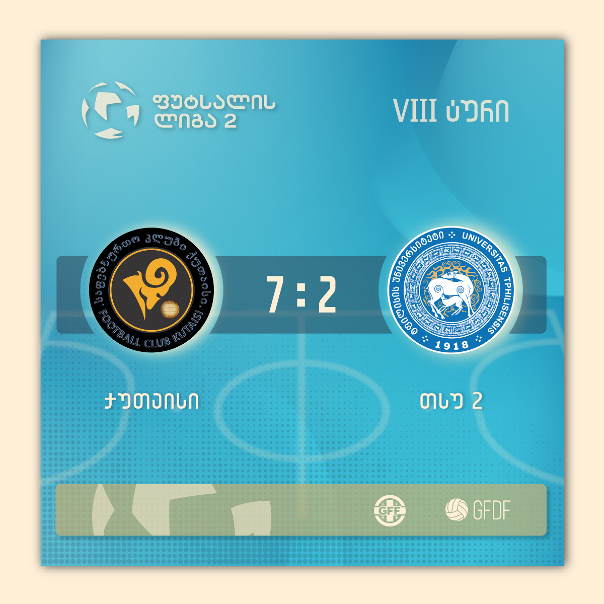 ფუტსალის ლიგა 2-ის ბოლო, მე-9 ტური, 2021 წელს, 27 დეკემებრს გაიმართება. მანამდე კი, ქუთაისის სპორტის სასახლეში მერვე ტურის მატჩები გაიმართა.