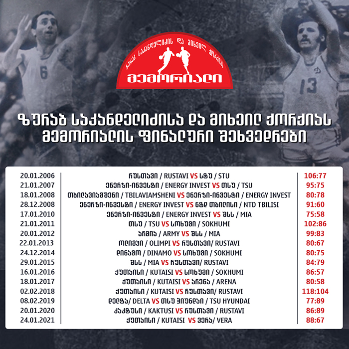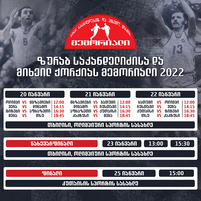 ქართველი ოლიმპიური ჩემპიონების - ზურაბ საკანდელიძისა და მიხეილ ქორქიას სახელობის მემორიალი 20-25 იანვარს გაიმართება. აღნიშნული ტურნირი ტრადიციულია, 2006 წლიდან ტარდება და წელს იგი მე-17-ედ გათამაშდება. მემორიალი დედაქალაქში დაიწყება, სადაც ჯგუფური ეტაპის მატჩები და ნახევარფინალები ჩატარდება, ხოლო ფინალს, ტრადიციულად, ზურაბ საკანდელიძისა და მიხეილ ქორქიას მშობლიური ქალაქი ქუთაისი უმასპინძლებს.