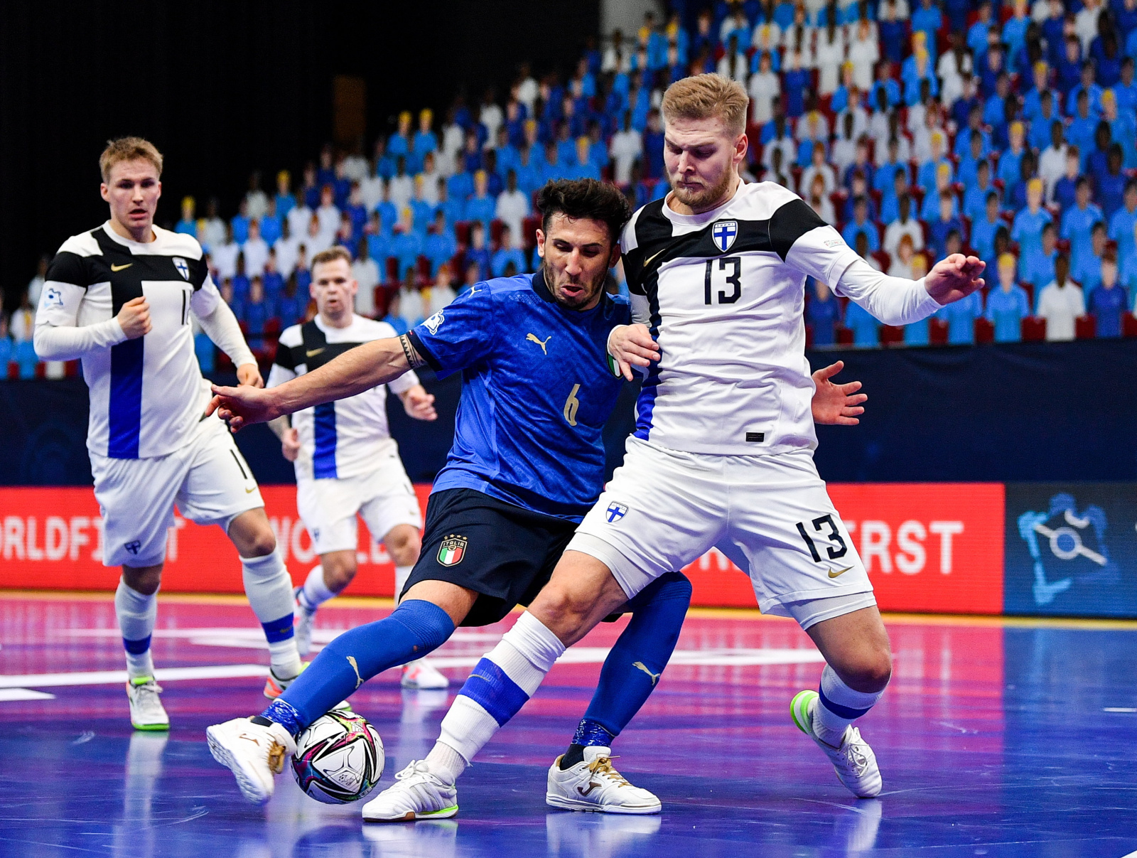 ანალოგიურად, დრამატულად წარიმართა ამ ჯგუფის მეორე შეხვედრა, რომელშიც იტალიამ, ფინეთს უმასპინძლა. ალბათ, თავიდანვე უნდა აღვნიშნოთ, რომ იტალიას ფუტსალში, ევროპის ჩემპიონატის ფინალი არასდროს გაუცდენია და უფრო მეტიც, 2003 და 2014 წლებში „სკუადრა აძურამ" მთავარი ტრიოფეიც კი მოიგო. აი, ფინეთის ნაკრები კი, მათგან განსხვავებით, ევროპის 16 საუკეთესო გუნდს შორის პირველად ასპარეზობს. შესაბამისად, როგორც ჩანს იტალიელები ზედმეტად თავდაჯერებულნი, გამოვიდნენ და შეხვედრის 53-ე წამზე საკუთარ კარში პირველი გოლი მიიღეს.
