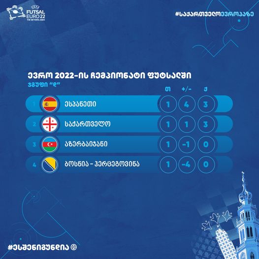 ხვალ, თბილისის დროით 20:30 წუთზე, გრონინგენში, ფუტსალში, ევრო 2022-ის D ჯგუფის მეორე ტურის პირველ მატჩში საქართველოს ეროვნული ნაკრები, ბოსნია და ჰერცეგოვინას ეროვნულ ნაკრებს დაუპირისპირდება. ჯგუფის მეორე შეხვედრას, გუნდები სხვადასხვა განწყობით, თუმცა, კონკრეტული თამაშის მოგების სურვილით ხვდებიან. „მარტინ პლაზაში", დღეს ჯერ ბოსნიელებმა ივარჯიშეს, შემდეგ კი, ჩვენმა ნაკრებმა. თუ მატჩისწინა, ტრადიციული პრეს-კონფერენციებით ვიმსჯელებთ, რომელიც კვალვ, ონლაინ-რეჟიმში გაიმართა, ორივე გუნდში საბრძოლო განწყობაა.