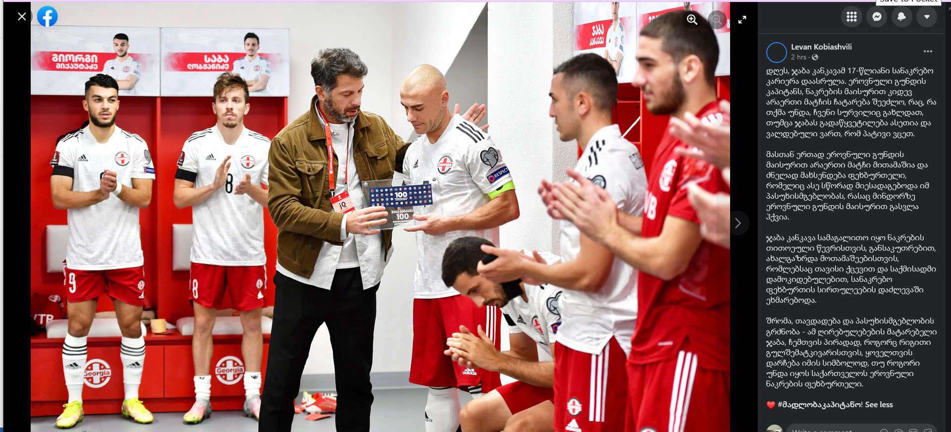 მას შემდეგ, რაც ცნობილი გახდა, რომ საქართველოს ეროვნული საფეხბურთო ნაკრების კაპიტანმა, ჯაბა კანკავამ, სანაკრებო კარიერის დასრულების შესახებ გადაწყვეტილება მიიღო და ის, საკუთარი ინსტაგრამ-გვერდით გაასაჯაროა, სფფ-ს პრეზიდენტი, ლევან კობიაშვილი, კანკავას განცხადებას, სოციალური ქსელის პირადი გვერდიდან გამოეხმაურა.