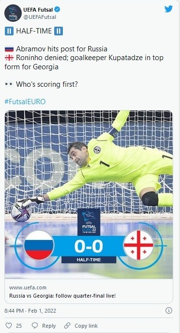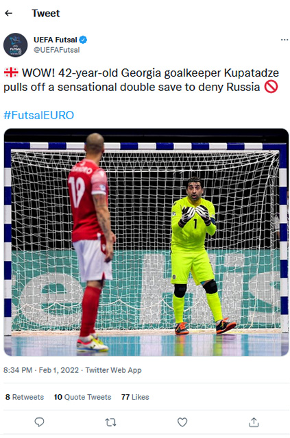დღეს, საქართველოსა და რუსეთის ფუტსალის ეროვნული ნაკრებების დაპირისპირების დასრულების შემდეგ, რომელიც რუსების გამარჯვებით, 3-1 დასრულდა, უეფა-ს ოფიციალურმა ვებ-გვერდმა, კიდევ ერთხელ გაიხსენა ქართული გუნდის გზა, ევრო 2022-ის 1/4 ფინალამდე , 13-მატჩიანი კამპანია, შესარჩევი რაუნდის ჩათვლი არის რეკორდული, რომელიც ქართულმა გუნდმა, ახალი ფორმატისა და ახალი შესარჩევი ციკლის დაწყების დღიდან, საკუთარი პროგრესის ხარჯზე მოახერხაო, წერს ევროპული ფეხბურთის მთავარი გვერდი და დასძენს, რომ მეოთხედფინალი გამორჩეული იყო, კარის მიმართულებით შესრულებული დარტყმების მხრივაც. საერთო ჯამში, გუნდებმა მოწინააღმდეგის კარს 98-ჯერ შეუტიეს, მართალია, რუსებმა ეს, ორჯერ მეტჯერ გააკეთეს, (ისევე როგორც კარის ჩარჩოში დარტყმების შეფარდებისას 21/10-თან), თუმცა მთელი მატჩის მანძილზე, უეფა-ს ე.წ. ტექტსტური „ლაივი" და ტვიტერი, ფეხბურთის გულშემატკივარს ახსენებდა, რომ საქართველოს ნაკრების კარს, გუნდის ლიდერი, ზვიად კუპატაძე იცავდა.