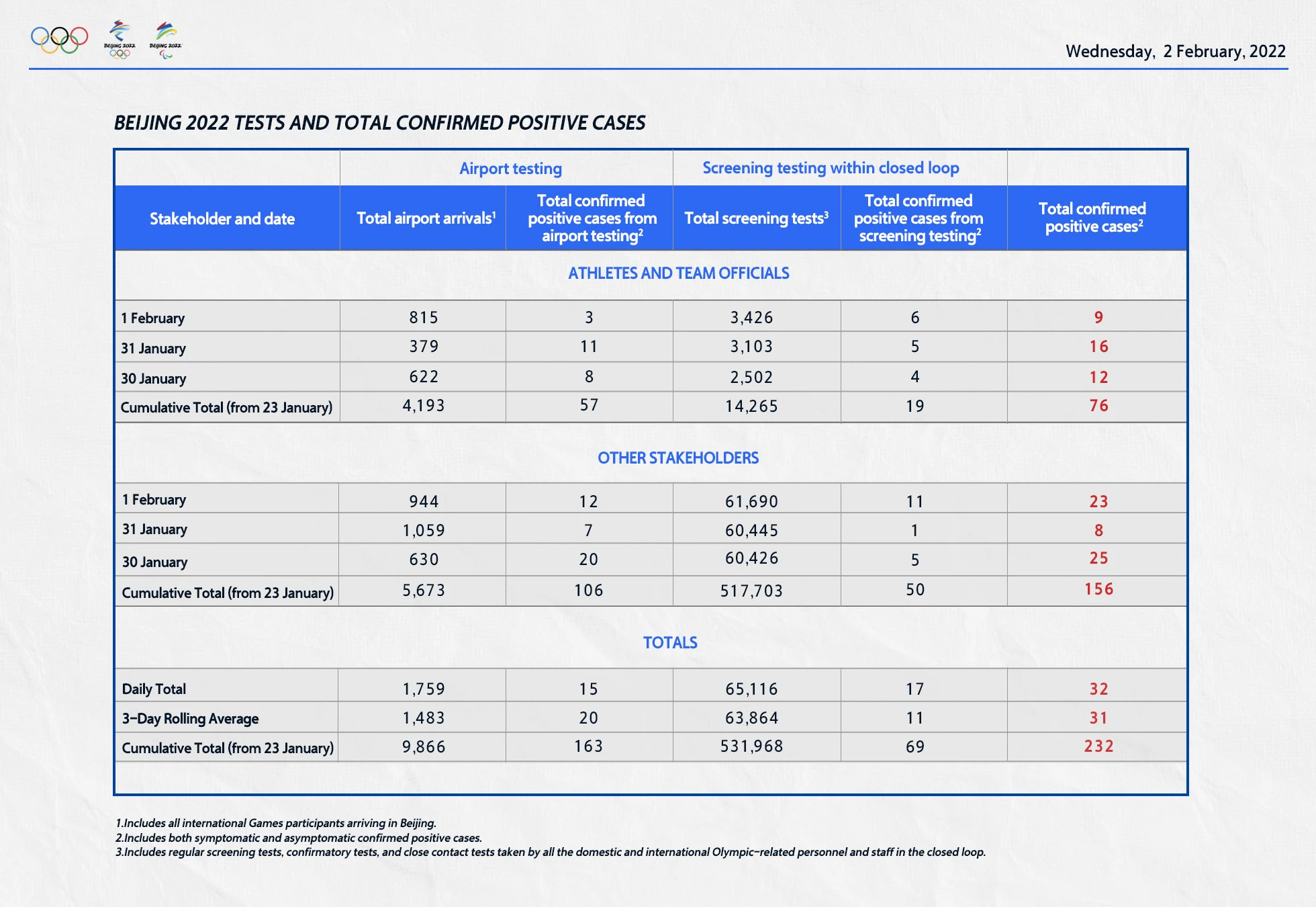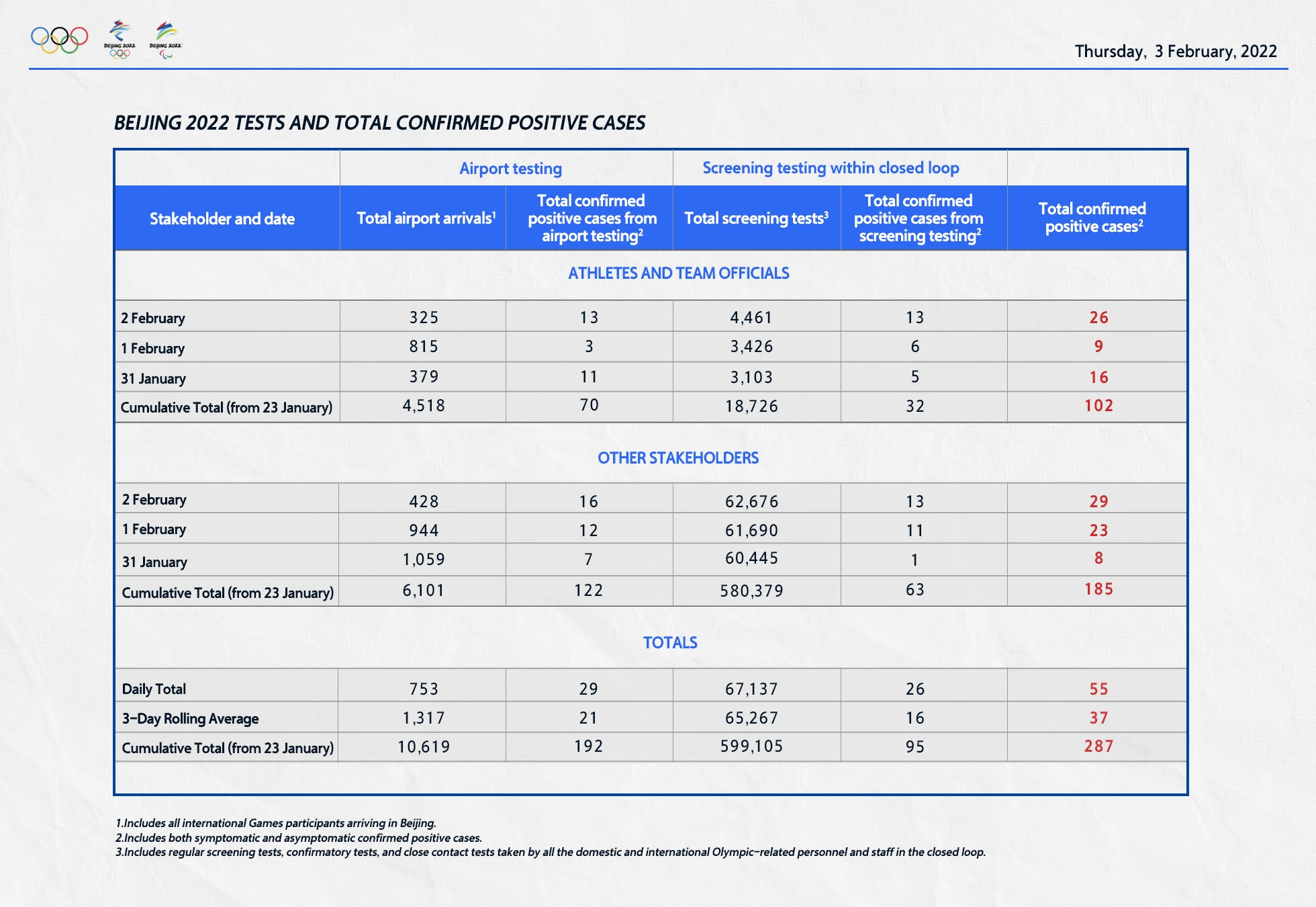 მაგალითად, 23 იანრიდან მოყოლებული 2 თებერვლის 23:59 საათის მონაცემებით, მხოლოდ, პეკინის აეროპორტში ზამრის ოლიმპიადაში მონაწილე 4518 ათლეტს, თამაშებთან კავშირში მყოფ 6101 სტეიკჰოლდერს PCR ტესტები ჩაუტარდათ. ამ ხნის მანძლზე, კოვიდ დადებითი 192 პირი აღმოჩნდა, აქედან 29 შემთხვევა, მხოლოდ, 2 თებერვალს დაფიქსირდა. მათ შორის 13 იყო სპორტსმენი, დანარჩენი 16 სტეიკჰოლდერი. აღსანიშნავია, რომ კოვიდ დადებითი პირები სავალდებულო იზოლაციაში გადაჰყავთ. საერთაშორისო მედიის ცნობით, უარყოფითი პასუხის მიუხედავად, დელეგაციებს, ვიდრე განმეორებით ტესტზე უარყოფითი პასუხი არ მიუვათ, საერთო სარგებლობის სივრცეებში შესვლის უფლება არ აქვთ.