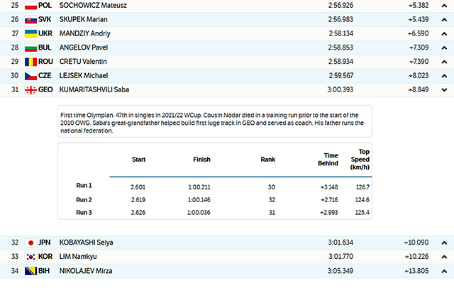 დღეს, ანასტასია გუბანოვას შემდეგ, პეკინის ზამთრის 2022 წლის ოლიმპიურ თამაშებზე, საქართევლოს გუნდის კიდევ ერთმა წარმომადგენელმა, საბა ქუმარიტაშვილმა იასპარეზა და ზამთრის ოლიმპიურ თამაშებზე ასპარეზობა დაასრულა. ქართველმა მოციგავემ, რომლისთვისაც რიგით 24-ე ზამთრის ოლიმიური თამაშები სადებიუტო იყო, სამი მცდელობის შემდეგ 31-ე შედეგი დააფიქსირა.