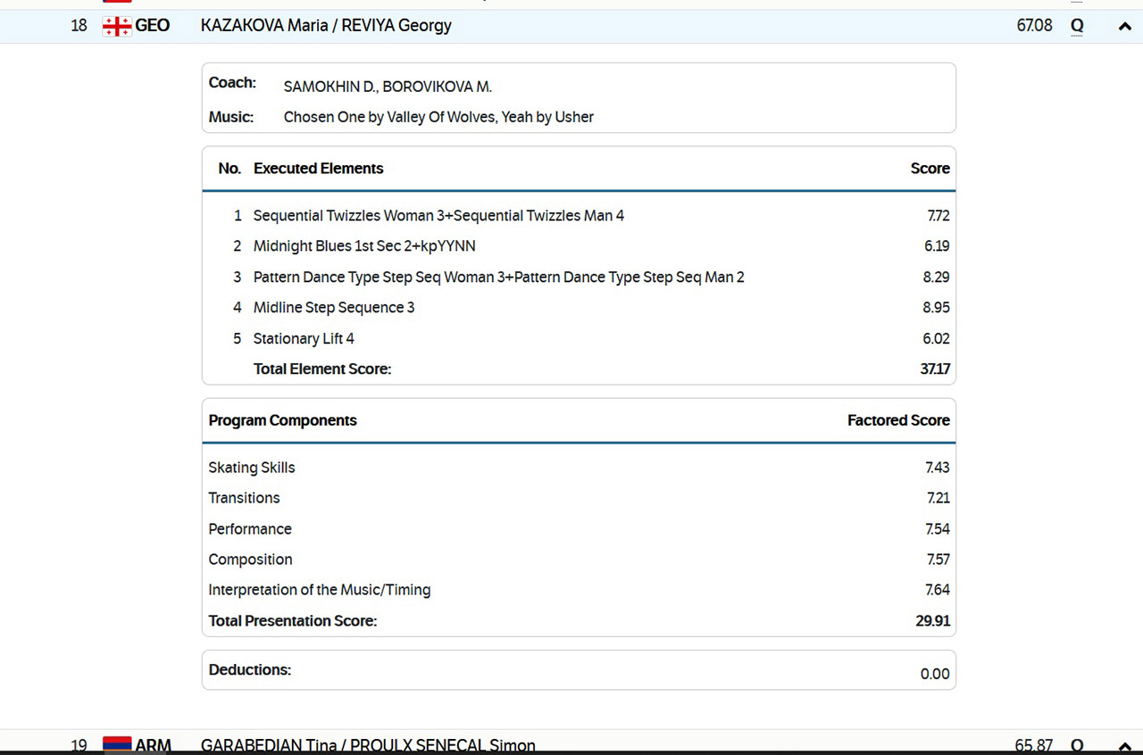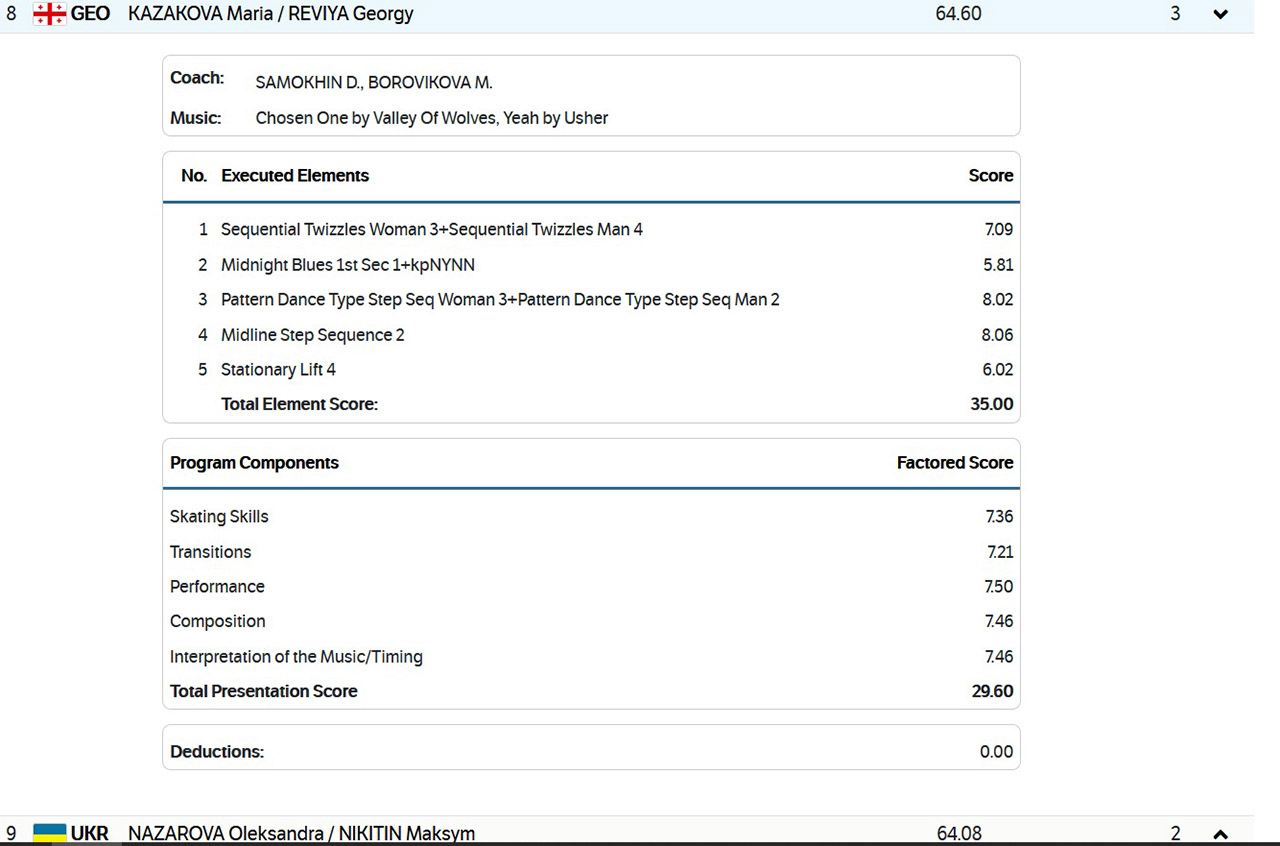 თუ, ქართული წყვილის 8 დღის წინანდელ და დღევანდელ გამოსვლას ამ ჭრილშიც შევაფასებთ, გუნდური ასპარეზობის შემდეგ, კაზაკოვა-რევიას წყვილს მსაჯებმა მცირედით, თუმცა, უკეთესი შეფასება მისცეს. მაგალითად, თუკი გუნდური ასპარეზობისას ჩვენებმა 64.60 (35.00 / 29.60) ქულა აიღეს, დღეს მათი შედეგი 67.08 (37.17 / 29.91) ქულა იყო. შესაბამისად, პეკინში ნაჩვენები შედეგი, 2.48 ქულით გააუმჯობესეს. სხვათა შორის წყვილმა, დღეს, პირადი რეკორდიც (66.95 ქულა) გააუმჯობესა. ფაქტია, რომ შეჯიბრებზე გამოსვლის პრაქტიკა, კაზაკოვა-რევიას წყვილზე, გარკვეული დროის შემდეგ, შედგეს აუცილებლად გამოიღებს.