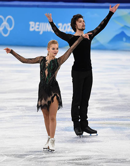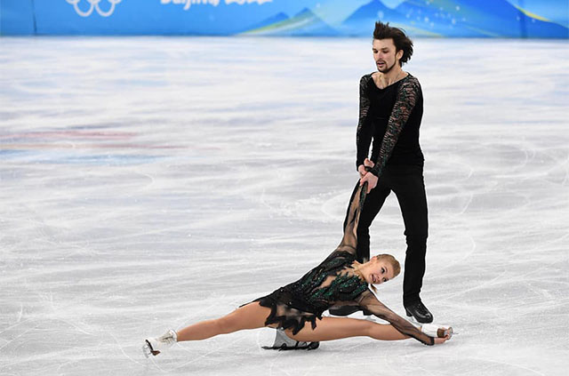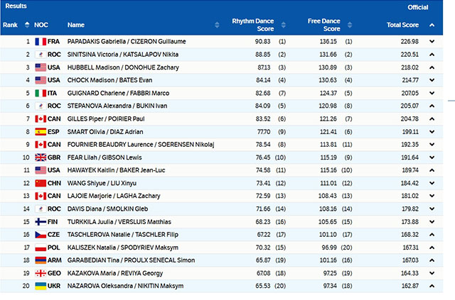 სპორტულ წყვილებში კი, საპრიზო სამეული ასე გადანაწილდა: ოლიმპიური ჩემპიონი ფრანგები - გაბრიელა პაპადაკისი და ჟილომ სიზერონი (226.98) გახდნენ. ვერცხლის მედალი რუსულ წყვილს, ვიქტორია სინიცინასა და ნიკიტა კაცალაპოვს (220.51) ერგოთ. ბრინჯაოს მედლის მფლობელები კი ამერიკელები - მედისონ ჰუბელი და ზაქარი დონოხიუ გახდნენ (218.02).