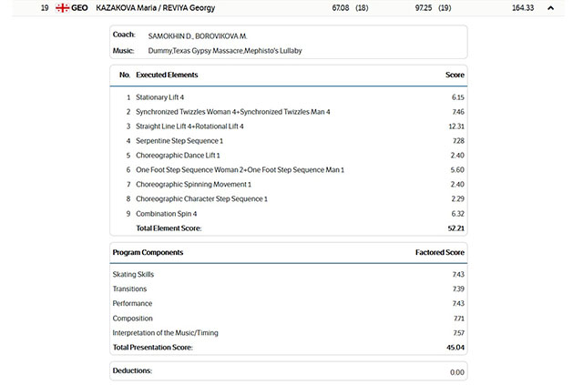 ანალოგიურ ვითარებაშია ქომაგიც, ამიტომ კიდევ ერთ მცირედ განმარტებას გავაკეთებ - სპორტულ ცეკვევებში, თავისუფალ პროგრამაში, სადაც მსაჯები იღებენ გადაწყვეტილებას, თუ როგორ შეაფასონ ესა თუ, ის ელემენტი და შესაბამისად, სპორტსმენსაც ქულები დაუწერონ, ყველაზე დიდი მნიშვნელობა ე.წ. ნაბიჯების თანმიმდევრობას ენიჭება. ერთ-ერთი ასეთი ელემენტის, რიგით მეექვსეს შესრულებისას, პანელმა ქართული წყვილის გამოსვლიდან, „გადასახედად" შემოიტოვა, თუმცა, ისევე, როგორც კიდევ ერთი, მე-9, ბოლო ელემენტი, რაც საბოლოოდ, ჩვენების ქულებშიც აისახა. კაზაკოვა - რევიას წყვილმა ტექკნიკური ელემენტებისთვის 52.21, კომპონენტებისთვის 45.04 , საბოლოოდ ჯამში კი, 97.25 ქულა აიღო და თავისუფალ პროგრამაში მე-19 პოზიციას დასჯერდა.