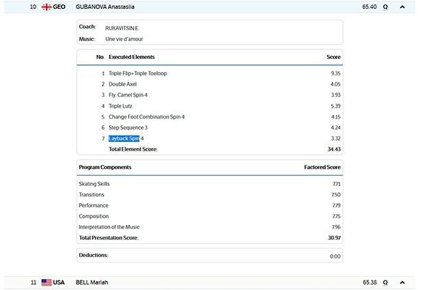 ბარემ, აქვე გეტყვით, რომ გუბანოვამ, ევროპელებიდან წინ მხოლოდ 3 რუსი და ერთი ბელგიელი გადაუშვა. მოკლე პროგრამის შემდეგ კი, პირველ ათეულში 3 რუსი, 2 იაპონელი, 2 კორეელი, 1 ბელგიელი და 1 ამერიკელი მოციგურავეები შევდინენ. კიდევ ერთი ამერიკელი, ანასტასიას „ზურგში სუნთქვს", მე-11 ადგილზე. საქართველოს წარმომადგენელმა მოკლე პროგრამაში 65.40 ქულა დააგროვა (ტექკნიკური ელემენტებისთვის 34.43, კომპონენტებისთვის 30.97), რაც თავის საუკეთესო შედეგზე 69.50 ქულაზე ოდნავ ნაკლებია, თუმცა, ოლიმპიურ თამაშებზე, მსაჯებიც ცოტა უფრო მკაცრები არიან.