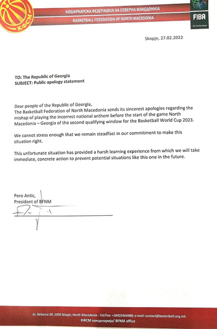ჩრდილოეთ მაკედონიის კალათბურთის ფედერაცია გულწრფელ ბოდიშს გიხდით 2023 წლის მსოფლიო ჩემპიონატის ჩრდილოეთ მაკედონია - საქართველოს საკვალიფიკაციო მატჩის წინ საქართველოს არასწორი ჰიმნის ჩართვის გამო.