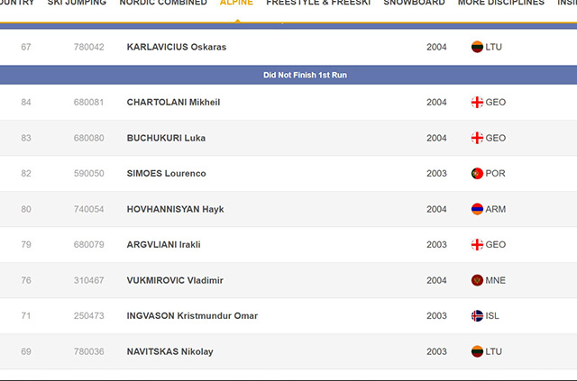 დღეიდან, 6 ქართველი სპორტსმენი, ოფიციალურად, ვუოკატიში მიმდინარე ევროპის XV ზამთრის ახალგაზრდულ ოლიმპიურ ფესტივალში ჩაერთო. პირველი სახეობა, რომელშიც ქართველებმა მიიღეს მონაწილეობა სამთო თხილამურებია. თუმცა, ჩვენი სამივე წარმომადგენელი, მიხეილ ჩართოლანი (2004), ირაკლი არღვლიანი (2003) და ლუკა ბუჩუკური (2004) ასპარეზობას სტარტზევე გამოეთიშნენ. სლალომში, მათ პირველი ცდისას ტრასის დასრულება ვერ მოახერხეს. სტარტზე სულ 84 სპორტსმენი გამოვიდა.