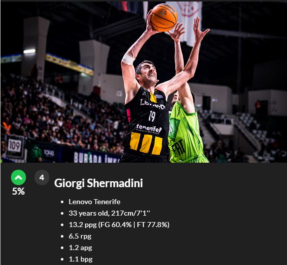 რომელ ტურნირშიც ასპარეზობს, გიორგი შერმადინი ყველგან ტოპ-პოზიციაზეა. მოახლოვდა ფიბა-ს ჩემპიონთა ლიგის ოთხთა ფინალი, რომელშიც ქართველი კალათბურთელის დიდი ძალისხმევის შედეგად ესპანური "ტენერიფეც" მოხვდა. ცხადია, შერმადინი იმ წამყვანი მოთამაშეების სიაშია, რომლებიც აღნიშნული ტურნირის სიმბოლურ ხუთეულში მოსახვედრად იბრძვიან. ხუთეულთან ერთად, გამოსავლენია სხვა ინდივიდუალური პრიზებიც - სეზონის საუკეთესო ახალგაზრდა, მწვრთნელი და MVP.