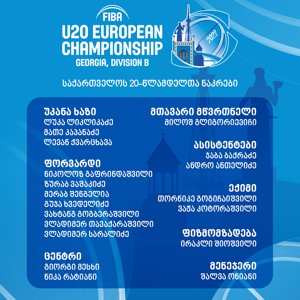 საქართველოს 20-წლამდელთა ნაკრების შემადგენლობაში 12 კალათბურთელია: