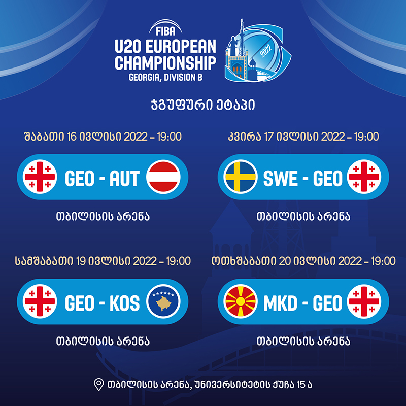 ჩვენი ნაკრები თამაშებს 16 (ავსტრიასთან), 17 (შვედეთთან), 19 (კოსოვოსთან) და 20 ივლისს (ჩრდ. მაკედონიასთან), ერთსა და იმავე დროს - 19:00 საათზე გამართავს.