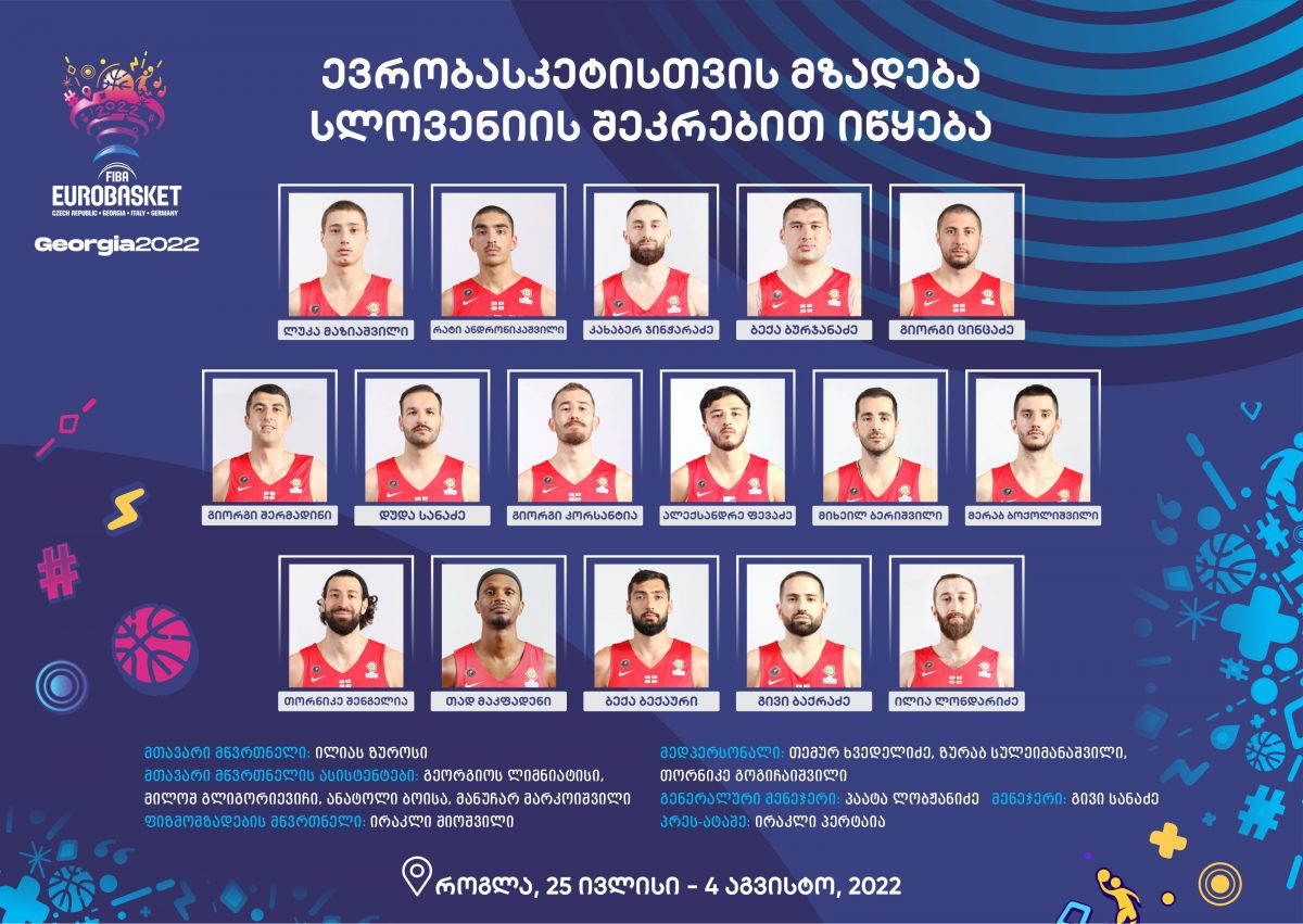 როგლაში, ილია ზუროსის მეთვალყურეობის ქვეშ 18 გამოძახებული კალათბურთელიდან, მხოლოდ 16 გაემგზავრა. ფედერაციის ვებ-გვერდის ცნობით, გოგა ბითაძე, რომელსაც მუხლის ტრავმა აწუხებს, შტატებში გაემგზავრა, სადაც თავის კლუბში სამედიცინო გამოკვლევას ხელმეორედ გაივლის და ამის შემდეგ გაირკვევა, როდის მოახერხებს ის, ნაკრებთან შეერთებას. მეორე კალათბურთელი, რომელიც ასევე დააკლდება სლოვენიურ სეკრებას, სანდრო მამუკელაშვილია.