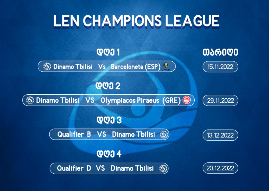 დაახლოებით ერთ თვეში, წყალბურთელთა კლუბი „დინამო თბილისი", ჩემპიონთა ლიგაზე დაიწყებს ასპარეზობას. აღნიშნული ტურნირის მეოთხე 2022-2023 წლების სეზონის სასტარტო შეხვედრას, ჩვენი გუნდი, 15 ნოემბერს, თბილისში, „ბარსელონეტას" წინააღმდეგ გამართავს.