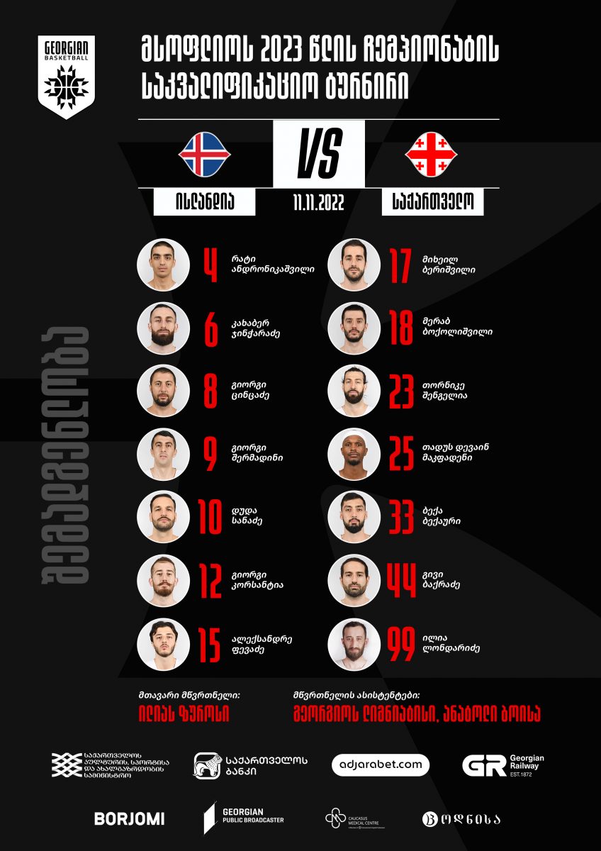 საქართველოს ნაკრები პირველ შეხვედრას ისლანდიის წინააღმდეგ, რეიკიავიკში, 11 ნოემბერს გამართავს. მატჩი, თბილისის დროით 23:30 საათზე დაიწყება და მისი დასრულებისთანავე, ზუროსის გუნდი საქართველოში, ჩარტერული რეისით გამოემგზავრება. მსოფლიოს 2023 წლის ჩემპიონატის ბოლო შესარჩევი ჯგუფის პრინციპული თამაშისთვისაც, ჩვენი ნაკრები შეკრებას სწორედ, ისლანდიაში შეუდგება. ქართველები რეიკიავიკში 7 ნოემბერიდან დაიწყებენ ჩასვლას - ყველა, საკუთარი კლუბებიდან -, გიორგი შერმადინი, ალექსანდრე ფევაძე, გიორგი კორსანტია, კახაბერ ჯინჭარაძე, თად მაკფადენი. თბილისიდან რეიკიავიკში გაემგზავრებიან გიორგი ცინცაძე, მიხეილ ბერიშვილი, მერაბ ბოქოლივშილი, ბექა ბექაური, გივი ბაქრაძე, ილია ლონდარიძე. რეიკიავიკში შეუერთდებიან ნაკრებს, დუდა სანაძე და რატი ანდრონიკაშვილი, რომლებიც ამ ეტაპზე უგუნდოდ არიან. კაპიტანი კი, მათ 10 ნოემბერს შეურეთდება.