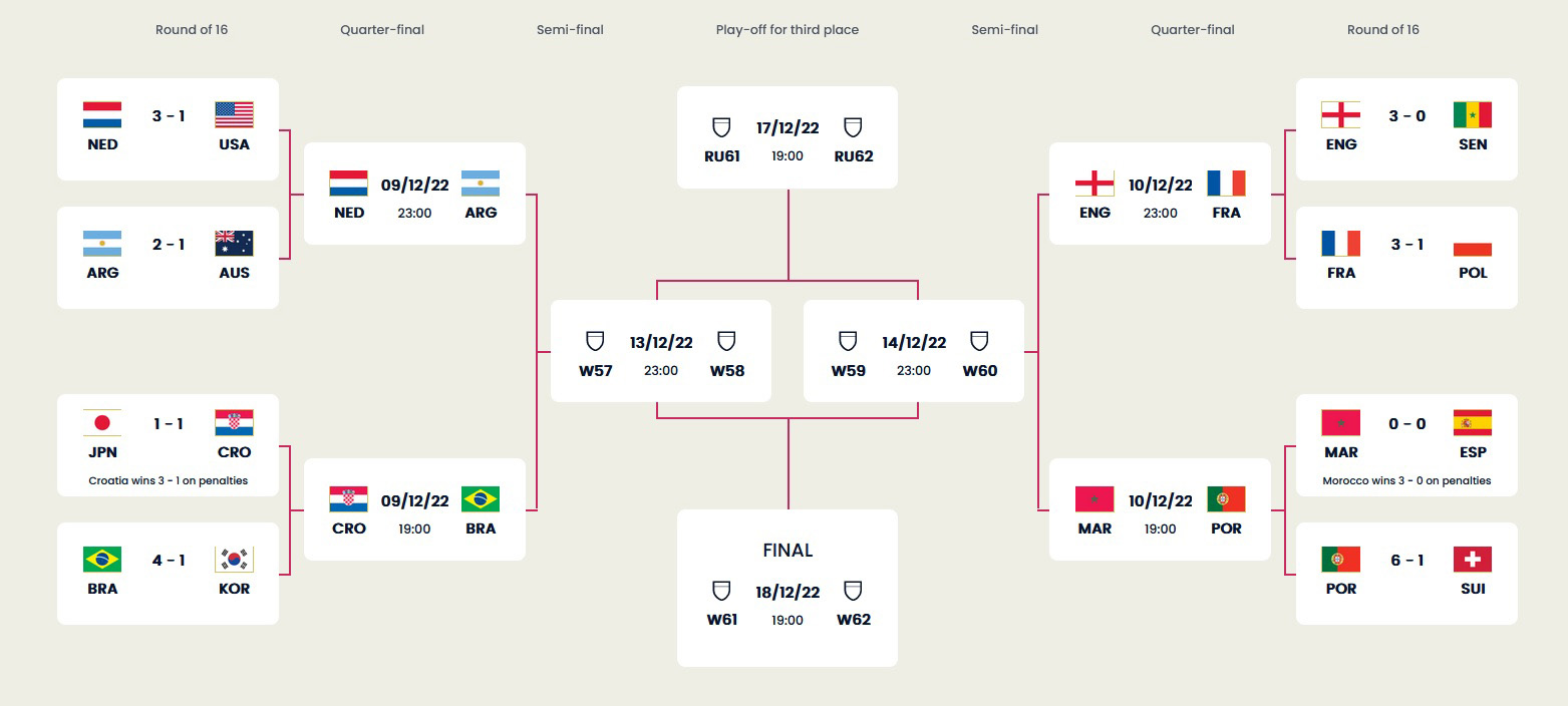 ხვალიდან, 9 დეკემბრიდან მსოფლიოს რიგით 22-ე მსოფლიო ჩემპიონატი გადამწყვეტ ფაზაში შედის. ტიტულის მაძიებელთა შორის უკვე აღარ არის ესპანეთის ნაკრები, რომელსაც ბევრი სულ მცირე, კატარში მიმდინარე გათამაშების ფინალისტად ხედავდა. თუმცა, ესპანელები, იმ მაროკოს ნაკრებმა გამოუშვა ევროპაში, რომელმაც, ჩემპიონატის დაწყებამდე, საქართველოს ნაკრები ამხანაგურ შეხვედრაში დაამარცხა და ჩვენში, წლების მანძილზე, ან ახლადგამოჩეკილი, ნაკრების თავზე ლაფის დამსხმელები „გაამხიარულა". შეგახსენებთ, რომ მაროკოელთა „სინდისზე" ჯგუფში ჩატოვებული ბელგიაცაა. ამას გარდა, მარიკოელებმა ნაწილობრივ, გერმანელთა გამოც „იძიეს შური". ალბათ, ისევე, როგორ ხორვატებმა. ისე, საინტერესოა, რომ 1/8 ფინალებში, სწორედ იაპონია-ხორვატიისა და ესპანეთი-მაროკოს წყვილის თამაშებში, გამარჯვებულები 11-მეტრიანებმა გამოავლინა. ამასთან, მომედევნო ეტაპზე გასული გუნდების მეკარეებმა 3-3 პენალტი მოიგერიეს...