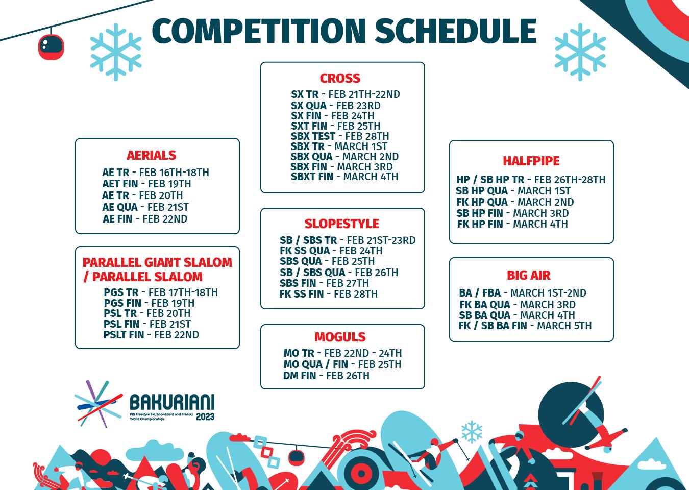აღსანიშნავია, რომ 18 დღის მანძილზე, ბაკურიანის 3 სხვადასხვა, საგანგებოდ, მსოფლიო ჩემპიონატისთვის მოწყობილ სტადიონზე 7 სახეობაში მედლების 2-2 (ქალები, მამაკაცები) ინდივიდუალურ სახეობებში და ერთიც (პირველი სამეული) გუნდურში (სქი-კროსი) კომპლექტს გაათამაშებს. ფრისტაილის, სნოუბორდისა და ფრისკის შეჯიბრებს დიდველისა და კოხტას ფერდობები უმასპინძლებენ.