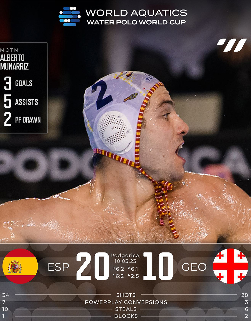 მონტენეგროსთან და ავსტრალიასთან თანაბარი და მძიმე თამაშების შემდგე დაღლილ, მსოფლიო თასზე მოასპარეზე დებიუტანტ საქართველოს ნაკრებთან, მსოფლიოს მოქმედ ჩემპიონს ესპანეთს, დაახლოებით სამი წუთი დასჭირდა, რომ ეჩვენებინა ვინ იყო „ბატონი". სწორედ, ამ დროში ესპანელები 3 ბურთით დაწინაურდნენ. მიუხედავად იმისა, რომ აქ, ვასიჩმა, ერთი ბურთის გაქვითვა მოახერხა, ესპანელებმა ორი გოლით უპასუხეს და უკვე 6 წუთის შემდეგ ანგარიშში 5-1 მიჰყავდათ. საბოლოოდ ეს პერიოდი 6-2 დასრულდა, ანალოგიური სცენარით და თითქმის იდენტური ანგარიშით დამთავრდა მეორე და მესამე მეოთხედები. აი, ბოლოში კი, ესპანეთმა საქმე გაკეთებულად ჩათვალა და უბრალოდ, თამაში ბოლომდე მიიყვანა. დასკვნითი მეოთხედის წინ ესპანეთი 14-4-ს გვიგებდა. შესაბამისად, ძალები შეინახეს. ქართველებმა კი, ბოლო პერიოდში, ოდნავ გაილაღეს და 2-5 მოიგეს. თუმცა, ეს ის თამაში და ანგარიში იყო, რომელსაც ესპანეთი თავიდან ბოლომდე აკონტროლებდა. რაც შეეხება ჩვენს გუნდს, მარცხის მიუხედავად, საქართველოს ნაკრებმა „კარგი გაკვეთილი" შეისწავლა.