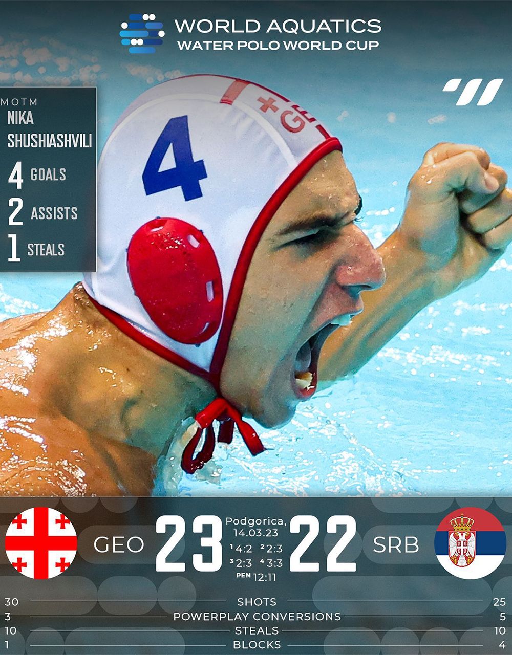 დღეს, საქართველოს წყალბურთელთა ეროვნულმა ნაკრებმა მსოფლიოს თასის B ჯგუფის ბოლო შეხვედრა ჩაატარა, მოქმედ ოლიმპიურ ჩემპიონთან, სერბეთის ეროვნულ ნაკრებთან და პენალტების სერიაში მოიგო. მატჩის ძირითადი დრო ფრედ, 11-11 დასრულდა. ფრე, 4-4 დაფიქსირდა პენალტების სერიაშიც, თითო ბურთი მეკარეებმა მოიგერიეს, საბოლოოდ კი, გამარჯვებული გაფუჭებულმა პენალტმა გადაწყვიტა. უფრო ზუსტად, რაზმაძემ ბოლო დარტყმული აუღო ვუნიჩიჩს, იმნაიშვილმა კი, ბოლო პენალტი ზუსტად შეასრულა და საბოლოოდ ჩვენმა ნაკრებმა 23-22 გაიმარჯვა. ამით, საქართველოს ნაკრებს მსოფლიო თასზე მეორე შეხვედრა მოიგო.