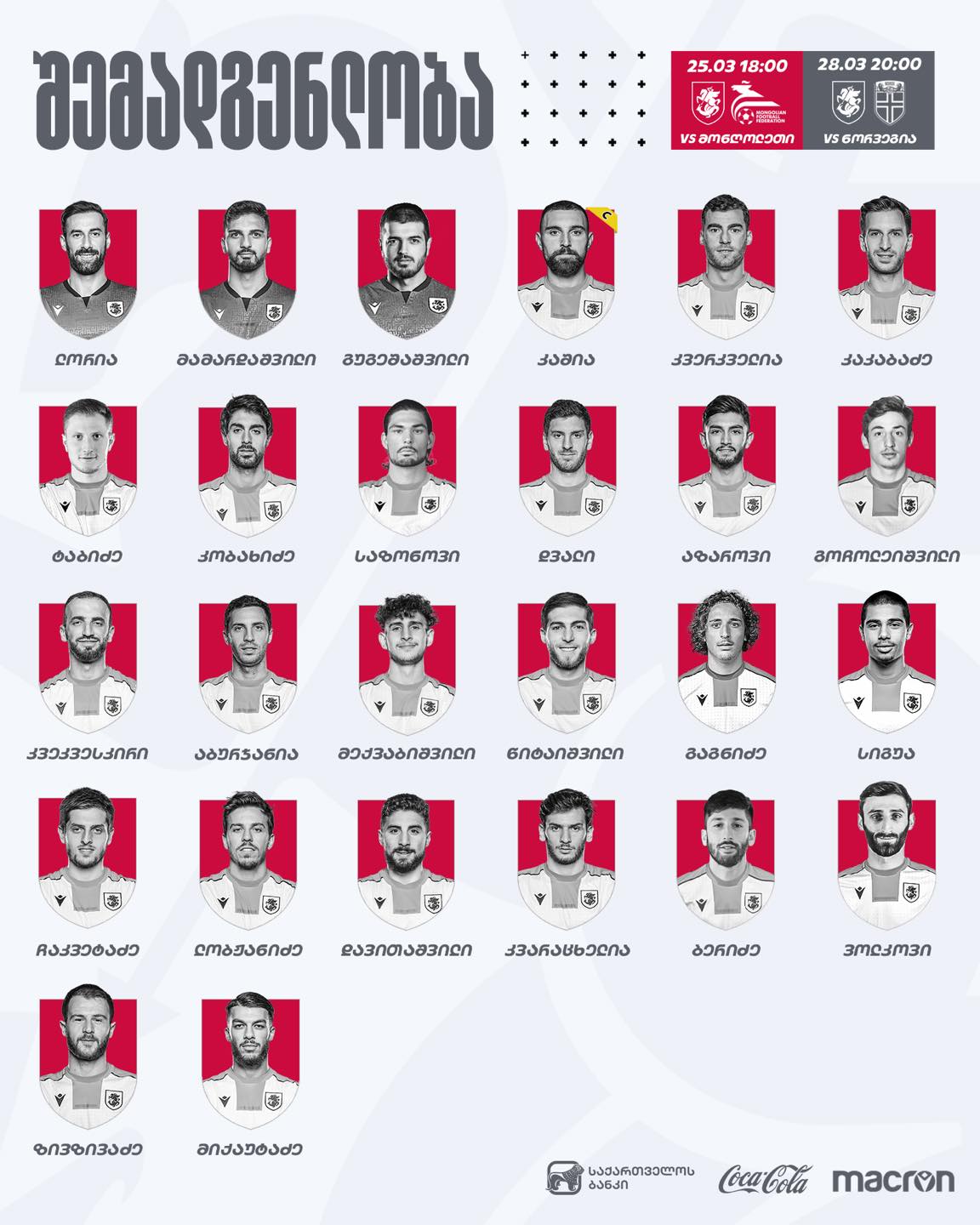 საქართველოს ნაკრები ევრო 2024 წლის საკვალიფიკაციო ჯგუფის სასტარტო შეხვედრამდე ბოლო ამხანაგურ თამაშს, 25 მარტს, 18:00 საათზე ბათუმში, მონღოლეთის წინააღმდეგ ჩაატარებს. 28 მარტს კი, 20:00 საათზე ვილი სანიოლის გუნდი, ევრო 2024-ის შესარჩევი ეტაპის პირველ ტურში ნორვეგიას დაუპირისპირდება.