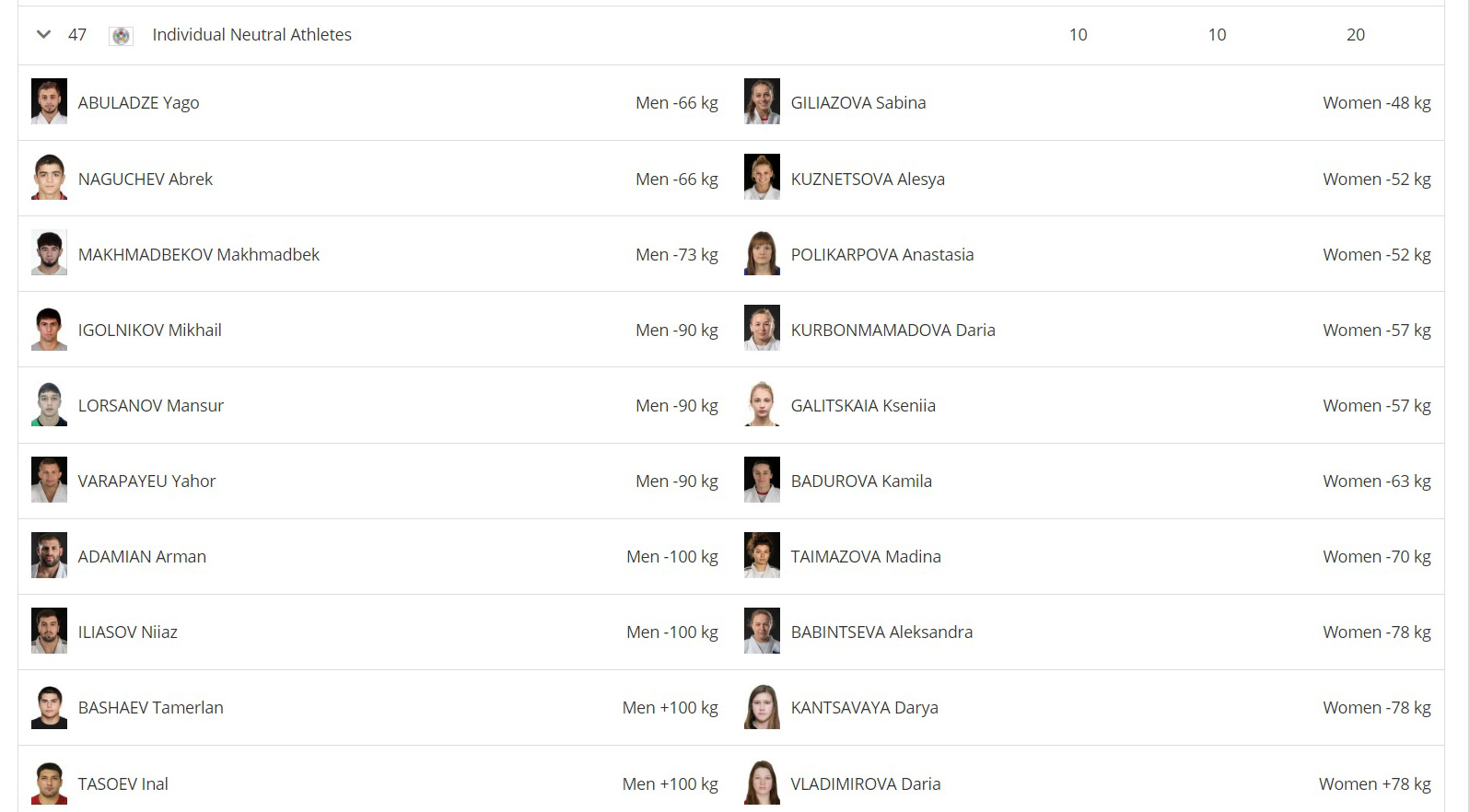 განაცხადში, რომელიც ძიუდოს საერთაშორისო ფედერაციაში ამ დროისთვის არის გაკეთებული, საერთო ჯამში 20 რუსი და ბელარუსი ეროვნების ათლეტია შეყვანილი. მათგან ხუთი, რუსეთის არმიის ცენტრალურ კლუბს წარმოადგენს. ხუთიდან ოთხი, ერთი წლის წინ უფროსი სერჟანტის წოდებით იყვნენ მოხსენიებული, თუმცა, მათი დღევანდელი სტატუსის დადგენა ჯერ-ჯერობით ვერ ხერხდება.