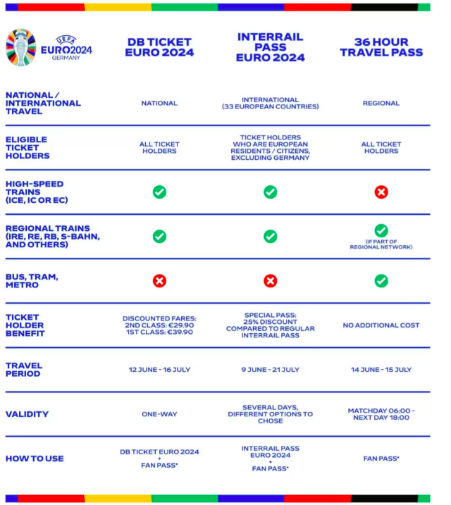 უეფამ გერმანიის მთავრობასთან ერთად გულშემატკივრებისთვის ახალი სამგზავრო კონცეფცია შეადგინა. ევრო 2024-ის ბილეთების მფლობელებს როგორც ეროვნულ, ასევე საერთაშორისო მატარებლის ბილეთებზე ფასდაკლებები ექნებათ, ამავდროულად, 36-საათიანი საზოგადოებრივი ტრანსპორტის სამგზავრო ბარათი.