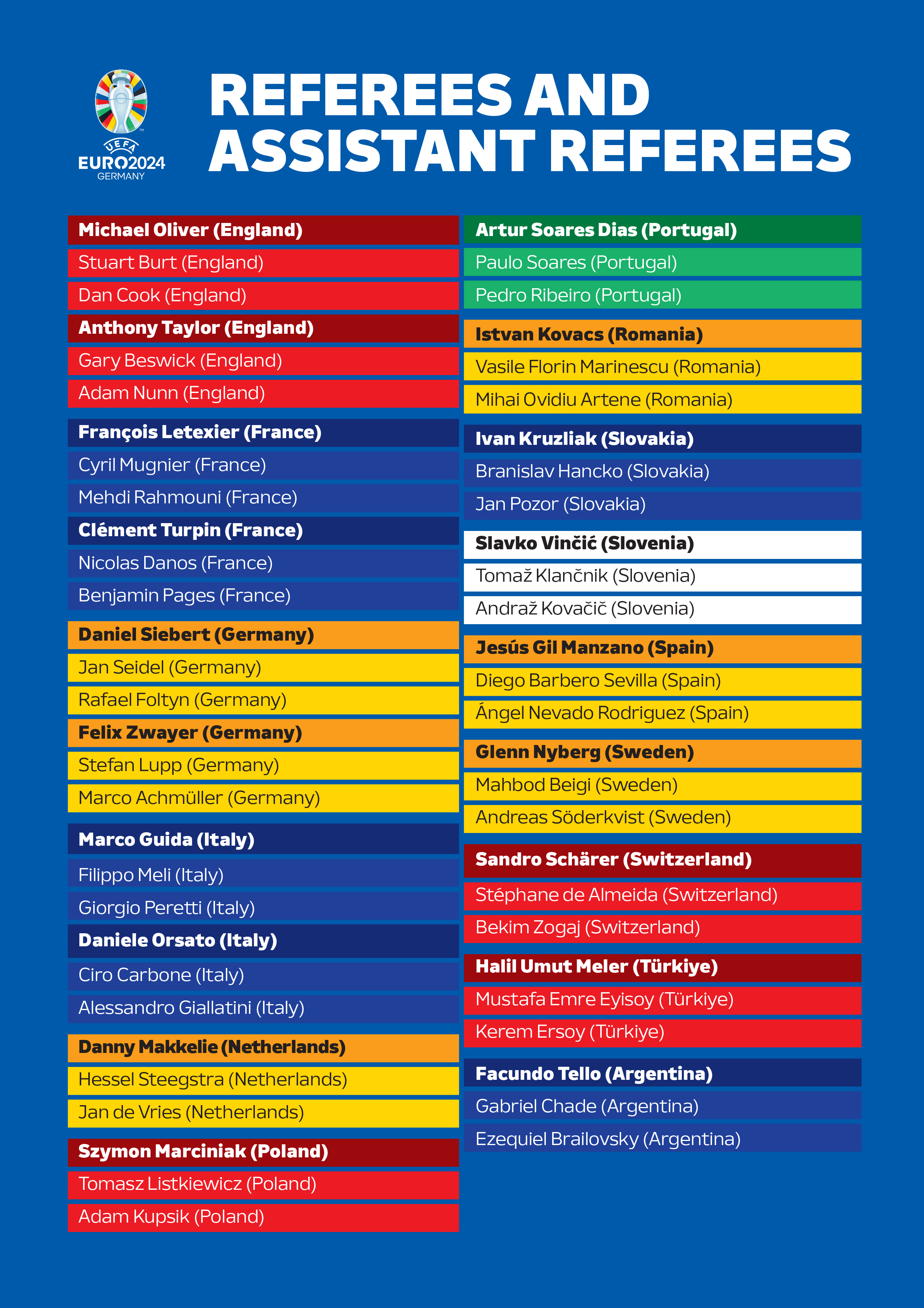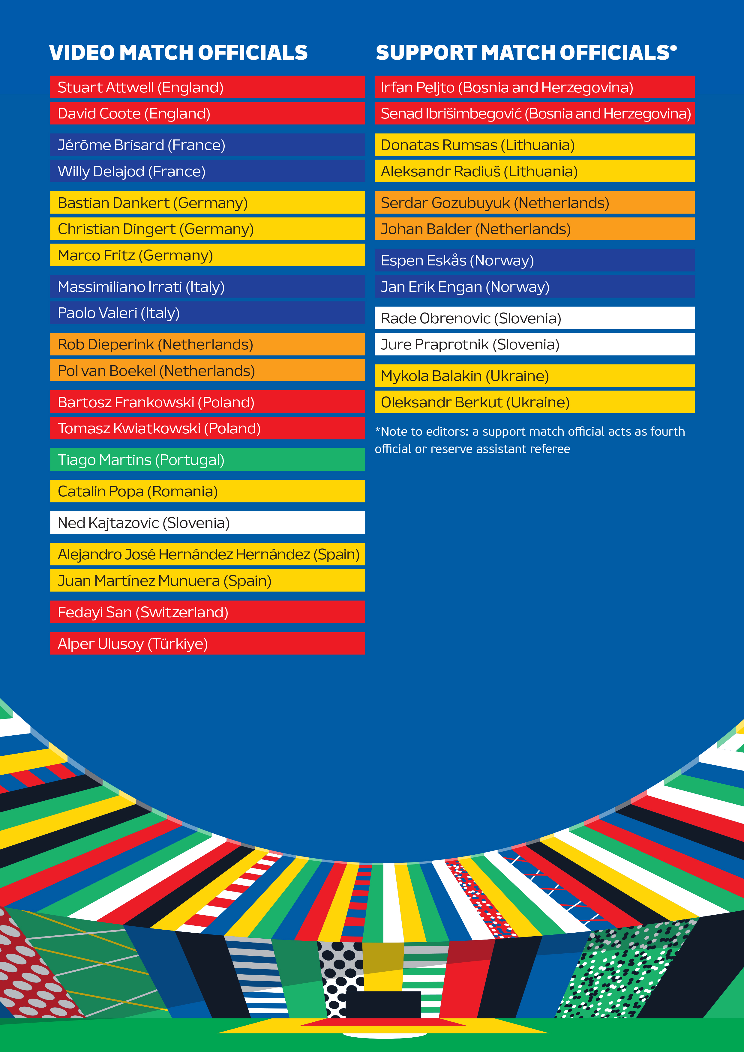 აქვე, გთავაზობთ მსაჯებისა და VAR-ის ბრიგადების ჩამონათვალს, რომლებიც უეფა-ს ევრო 2024-ს მოემსახურებიან.