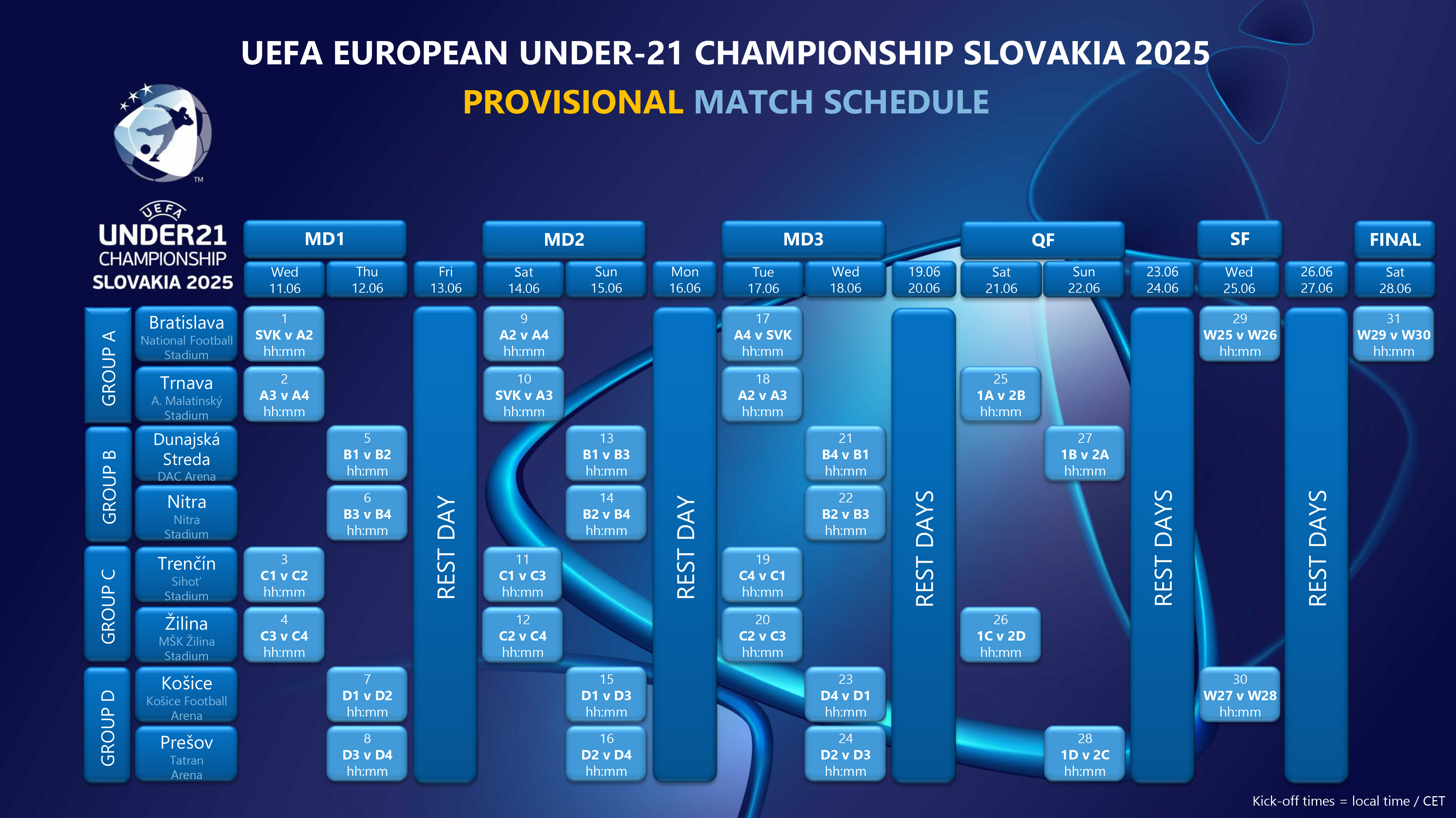სლოვაკეთი, რომელიც მზად არის ფეხბურთის მომავალი ვარსკლავების თაობას უმასპინძლოს, ახალგაზრდულ ჩემპიონატს მეორედ მასპინძლობს. თუმცა, ადრინდელისგან განსხვავებით, ამჯერად მასპინძელი ქალაქების რიცხვი სამიდან რვამდე გაზარდა. ფინალი, ბრატისლავაში ჩატარდება. საერთო ჯამში კი, ევროპის ახალგაზრდული ჩემპიონატის ფარგლებში 31 მატჩი ჩატარდება. სხვათა შორის, მატჩებზე დასასწრები ბილეთების გაყიდვა ხვალიდან, 4 დეკემბრიდან განახლდება.