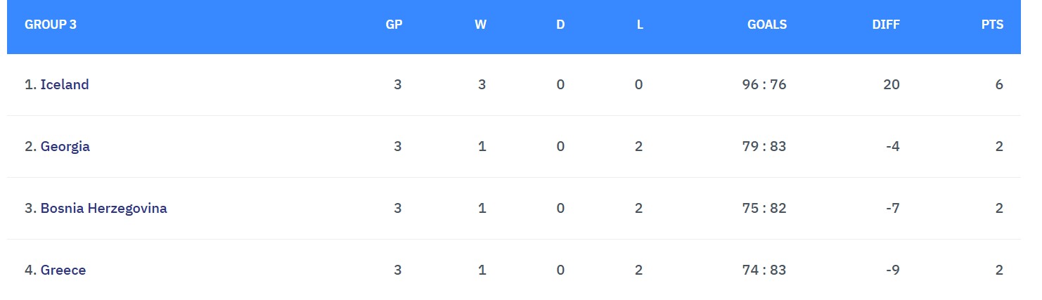 ამ მომენტისთვის, მე-3 ჯგუფში, რომელშიც საქართველოს ნაკრები ასპარეზობს, სამი ტურის შემდეგ, ქულების მაქსიმუმით, 6 ქულით, ისლანდიის ნაკრები ლიდერობს. ერთი მოგება და ორი წაგებით, ორი ქულა აქვს საქართველოს ნაკრებს, რომელიც ანალოგიური შედეგის მქონე ბოსნიისა და ჰერცეგოვინასა (-7) და საბერძნეთის (-9) ნაკრებებს, ბურთების უკეთესი სხვაობის ხარჯზე უსწრებს.