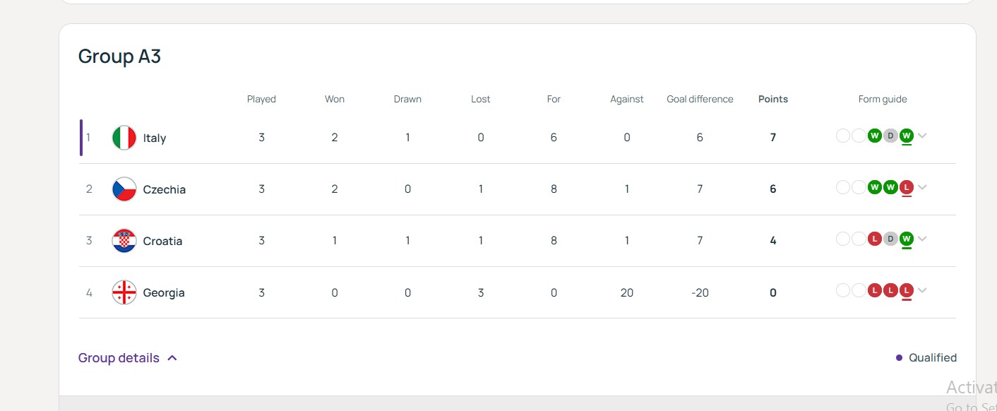 შესაბამისად ჩვენმა გუნდმა 0 ქულა დააგროვა, ჯგუფში ბოლო ადგილი დაიკავა და ტურნირის დებულების თანახმად, B ლიგაში გადაინაცვლა. ევროპის ჩემპიონატის საგზური კი, იტალიის ნაკრები გავიდა, რომელმაც ორი შეხვედრა მოიგო (საქართველოსთან და ჩეხეთთან, ამასთან ჩეხეთთან მინიმალური ანგარიშით გაიმარჯვა და ანგარიშთან ერთდ, შეხვედრა ორი ფეხბურთელით მეტობაში დაასრულა), ტურნირის მასპინძელ ხორვატიასთან კი ფრედ 0-0 ითამაშა.