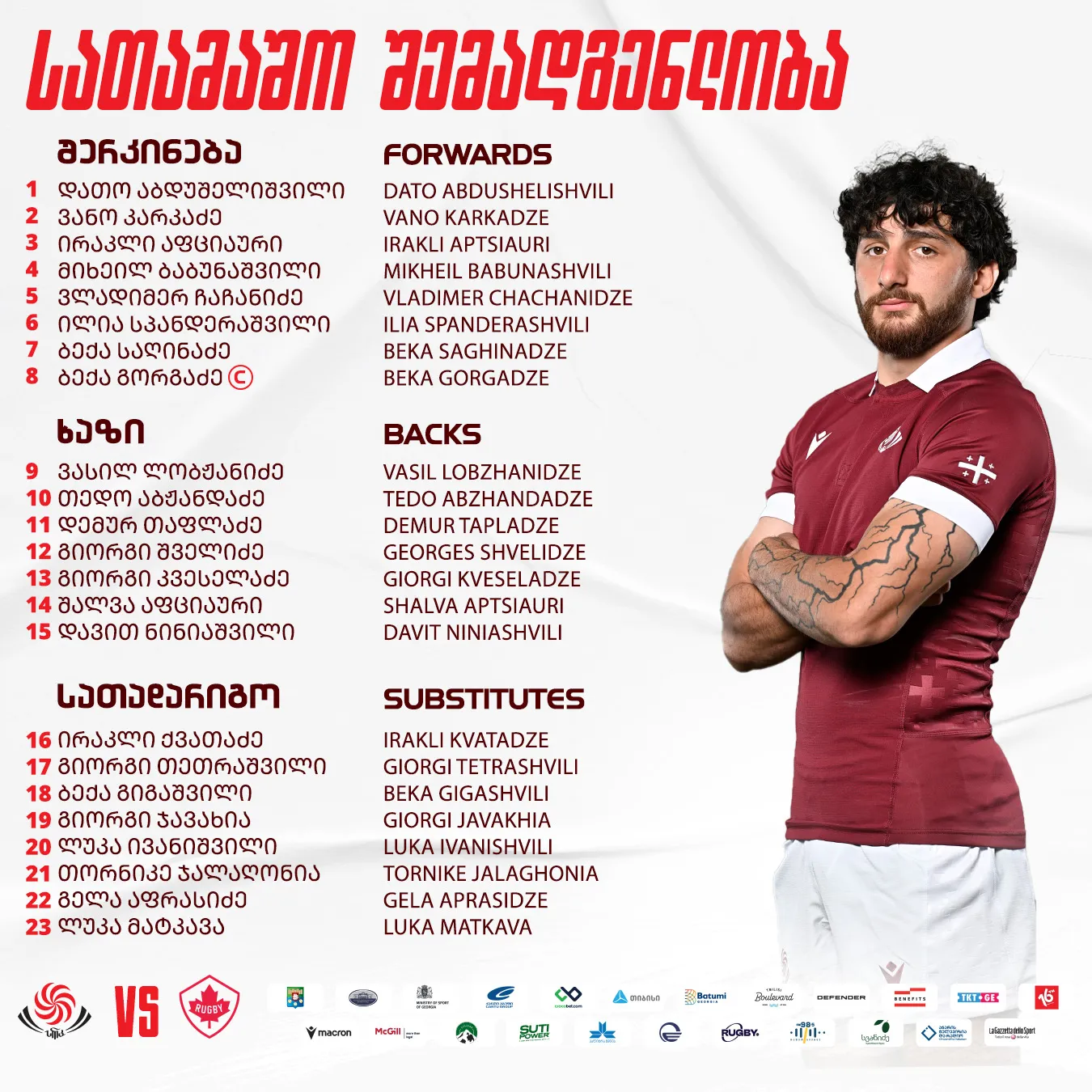 კანადასთან მატჩისთვის შერკინების მარქაფაში 6 მორაგბეა. სათადარიგოთა სკამზე გადაინაცვლეს კვაჭმა ირაკლი ქვათაძემ და ბურჯმა ბექა გიგაშვილმა, ასევე მესამეხაზელმა ლუკა ივანიშვილმა. იქ ადგილი შეინარჩუნა ბურჯმა გიორგი თეთრაშვილმა, მეორეხაზელი გიორგი ჯავახია და მესამეხაზელი თორნიკე ჯალაღონია კი ბორჯღალოსნებს ამ კვირაში შეუერთდნენ და მომავალ შეხვედრას თადარიგიდან იწყებენ.